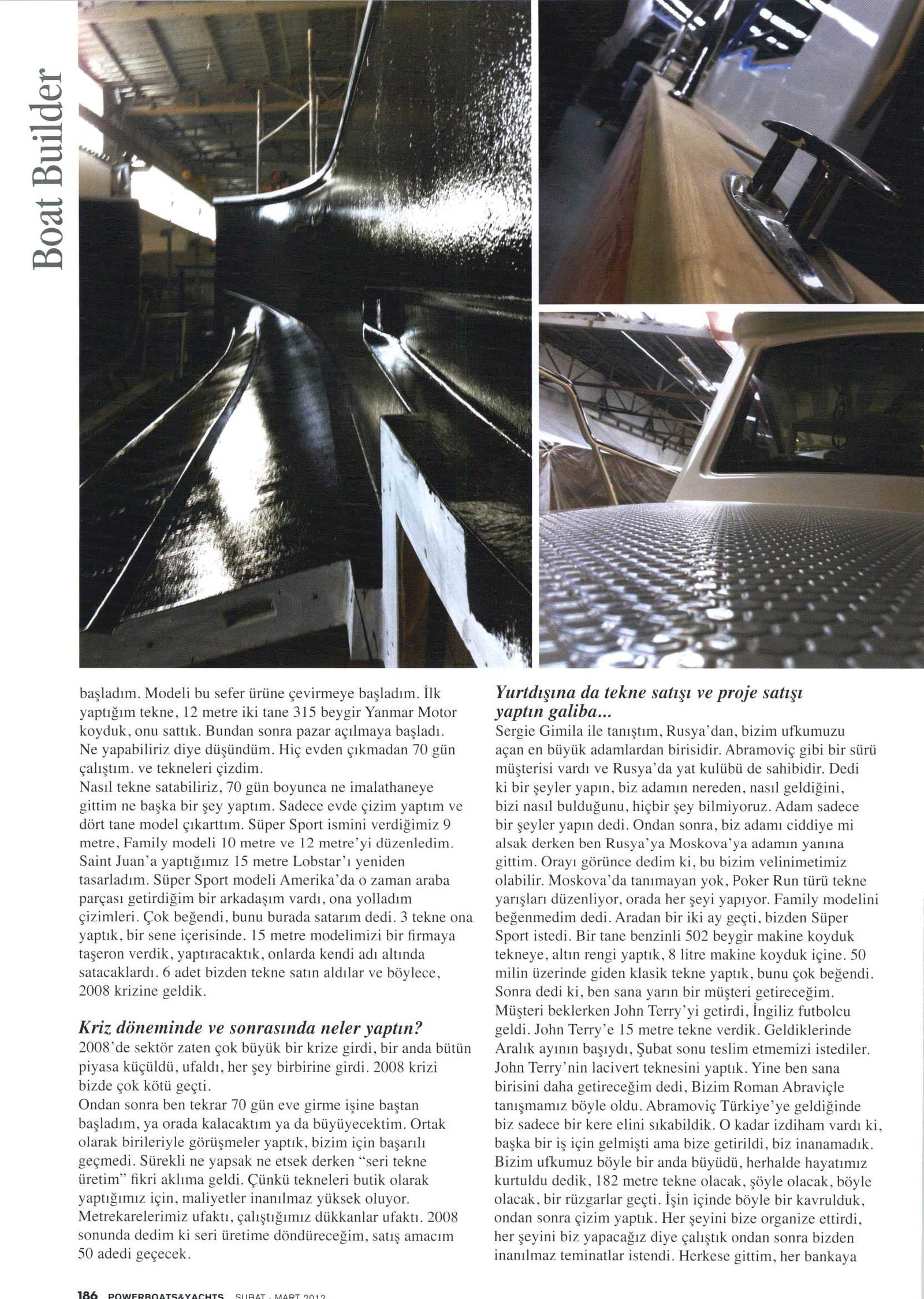 Sergie Gimila ile tanıştım, Rusya’dan, bizim ufkumuzu açan en büyük adamlardan birisidir. Abramoviç gibi bir sürü müşterisi vardı ve Rusya’da yat kulübü de sahibidir. Dedi ki bir şeyler yapın, biz adamın nereden, nasıl geldiğini, bizi nasıl bulduğunu, hiçbir şey bilmiyoruz. Adam sadece bir şeyler yapın dedi. Ondan sonra biz adamı ciddiye mi alsak derken ben Rusya’ya Moskova’ya adamın yanına gittim. Orayı görünce dedim ki, bu bizim velinimetimiz olabilir. Moskova’da tanımayan yok, Poker Run türü tekne yarışları düzenliyor, orada her şeyi yapıyor. Family modelini beğenmedim dedi. Aradan iki ay geçti, bizden Süper Sport istedi. Bir tane benzinli 502 beygir makine koyduk içine. 50 milin üzerinde giden klasik tekne yaptık, bunu çok beğendi. Sonra dedi ki, ben sana yarın bir müşteri getireceğim. Müşteri beklerken John Terry’yi getirdi, İngiliz futbolcu geldi. John Terry’e 15 metre tekne verdik. Geldiklerinde Aralık ayının başıydı, Şubat sonu teslim etmemizi istediler. John Terry’nin lacivert teknesini yaptık. Yine ben sana birisini daha getireceğim dedi, Bizim Roman Abraviçle tanışmamız böyle oldu. Abramoviç Türkiye’ye geldiğinde biz sadece bir kere elini sıkabildik. O kadar izdiham vardı, başka bir iş için gelmişti ama bize getirildi, biz inanamadık. Bizim ufkumuz böyle bir anda büyüdü, herhalde hayatımız kurtuldu dedi, 182 metre tekne olacak, şöyle olacak, böyle olacak, bir rüzgar geçti. İşin içinde böyle kavrulduk, ondan sonra çizim yaptık. Her şeyini bize organize ettirdi, her şeyini biz yapacağız diye çalıştık ondan sonra bizden inanılmaz teminatlar istedi. Herkese gittim, her bankaya gittim, iş nerede ise geliyordu. Gelecek paralar çok büyüktü 36 milyon dolar, ondan sonra biz bu teminatı bulamadık tabii, bizi aşan bir şey. Bu nedenle işi yurt dışımdan Lursen tersanesine verdiler. Ancak Lursen Teranesi’nin de çizimini beğenmediler ve bizim çizimi satın aldılar. Sohum tersanesinde şu an iş yapılıyor. Bu işi alamadığımıza üzüldük ancak, sadece çizim yapmamız bile bize inanılmaz şevk verdi. Demek ki bizim çizdiğimiz bir şeyler yurt dışında insanlar tarafından beğeniliyor. Bizim yaptığımız işler Rusya’da duyulunca Rusya’da iki üç gazetede haber olarak yer aldık. Bize bu tarz bir sürü avantaj sağladı ve gurur verdi.