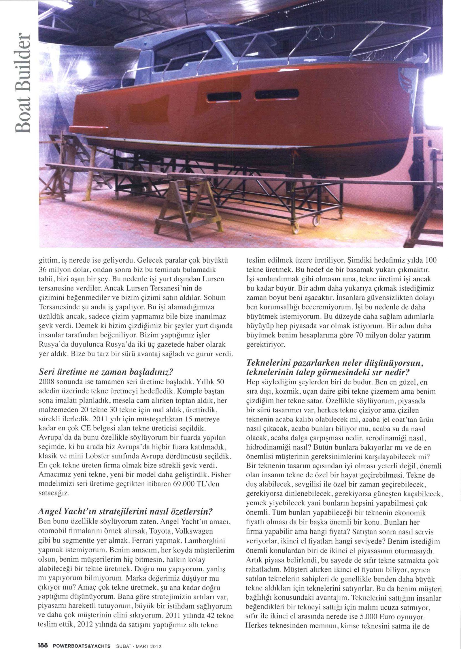 Ben bunu özellikle söylüyorum zaten Angel Yacht’ın amacı, otomobil firmalarını örnek alırsak. Toyota, Volkswagen gibi bu segmentte yer almak. Ferrari yapmak, Lamborghini yapmak istemiyorum. Benim amacım, her koyda müşterilerim olsun, benim müşterilerim hiç bitmesin, halkın kolay alabileceği bir tekne üretmek. Doğru mu yapıyorum, yanlış mı yapıyorum bilmiyorum. Marka değerimiz düşüyor mu çıkıyor mu? Amaç çok tekne üretmek, şu ana kadar doğru yaptığımı düşünüyorum. Bana göre stratejimizin artıları var, piyasamı hareketli tutuyorum, büyük bir istihdam sağlıyorum ve daha çok müşterinin elini sıkmak istiyorum. 2011 yılında 42 tekne teslim ettik. 2012 yılında da satışını yaptığımız altı tekne teslim edilmek üzere üretiliyor. Şimdiki hedefimiz yılda 100 tekne üretmek. Bu hedef de bir basamak yukarı çıkmaktır. İşi sonlandırmak gibi olmasın ama, tekne üretimi iyi ancak bu kadar büyür. Bir adım daha yukarıya çıkmak istediğimiz zaman boyut beni aşacaktır. İnsanlara güvensizlikten dolayı ben kurumsallığı beceremiyorum. İşi bu nedenle de daha büyütmek istemiyorum. Bu düzeyde daha sağlam adımlarla büyüyüp hep piyasada var olmak isti yorum. Bir adım daha büyümek benim hesaplarıma göre 70 milyon dolar yatırım gerektiriyor.