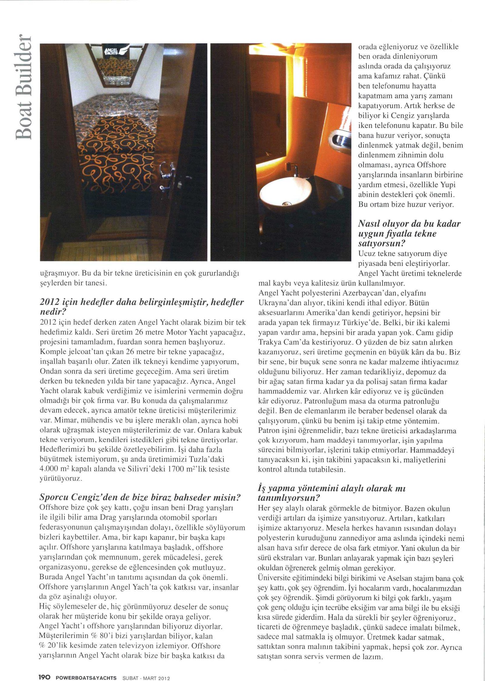 2012 için hedef derken zaten Angel Yacht olarak bizim bir tek hedefimiz kaldı. Seri üretim 26 metre Motor Yacht yapacağız, projesini tamamladım, fuardan sonra hemen başlıyoruz. Komple jelcoat’tan çıkan 26 metre bir tekne yapacağız, inşallah başarılı olur. Zaten ilk tekneyi kendime yapıyorum. Ondan sonra da seri üretime geçeceğim. Ama seri üretim derken bu tek neden yılda bir tane yapacağız. Ayrıca, Angel Yacht olarak kabuk verdiğimiz ve isimlerini vermemin doğru olmadığı birçok firma var. Bu konuda da çalışmalarımız devam edecek, ayrıca amatör tekne üreticisi müşterilerimiz var. Mimar, mühendis ve bu işlere meraklı olan, ayrıca hobi olarak uğraşmak isteyen müşterilerimiz de var. Onlara kabuk tekne veriyorum, kendileri istedikleri gibi tekne üretiyorlar. Hedeflerimizi bu şekilde özetleyebilirim. İşi daha fazla büyütmek istemiyorum, şu anda üretimimizi Tuzla’da ki 4.000 m2 kapalı alanda ve Silivri’de ki 1700 m2’1ik tesiste yürütüyoruz.