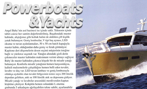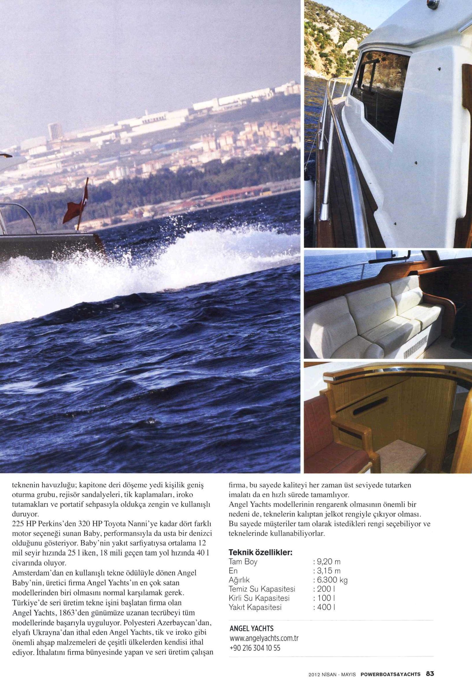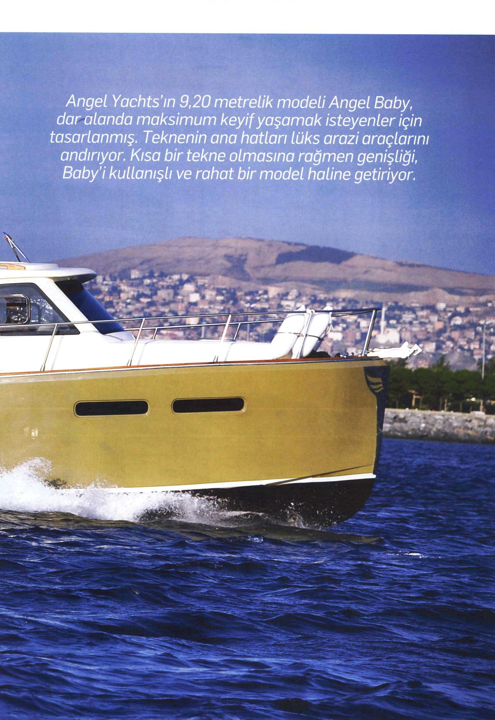 Amsterdam’dan en kullanışlı tekne ödülüyle dönen Angel Baby’nin, üretici firma Angel Yachts’ın en çok satan modellerinden biri olmasını normal karşılamak gerek. Türkiye’de seri üretim tekne işini başlatan firma olan Angel Yachts, 1863’den günümüze uzanan tecrübeyi tüm modellerinde başarıyla uyguluyor. Polyesteri Azerbaycan’dan, elyafı Ukrayna’dan ithal eden Angel Yachts, tik ve iroko gibi önemli ahşap malzemeleri de çeşitli ülkelerden kendisi ithal ediyor. İthalatını firma bünyesinde yapan ve seri üretim çalışan firma, bu sayede kaliteyi her zaman üst seviyede tutarken imalatı da en hızlı sürede tamamlıyor.